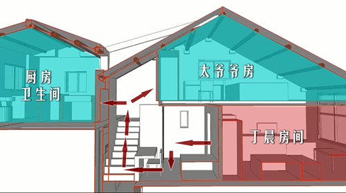 史老師在改造的過程中,運用「二層變四層」的空間錯層解決思路,充分利用了小丁當一家“坐臥行駛”的具體需求,把原先的兩層空間擴展成了四層空間。在這四層空間中,魔法般的變出了10大功能區、近100個儲藏空間,不僅滿足了四代人分別擁有自己獨立臥室的需要,還設計了獨立的客廳、廚房,衛生間從原來與廚房共用改造成了獨立衛生間,而且是上下兩個獨立的衛浴空間,充分照顧到四代人不同的使用需求。