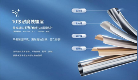 電鍍層數越多,抗腐蝕性越強。優質花灑需經過酸洗→拋光→電鍍(鎳層+鉻層)→鹽霧測試等12道工序,達到10級電鍍標準(國標為9級),可保證10年不生銹。