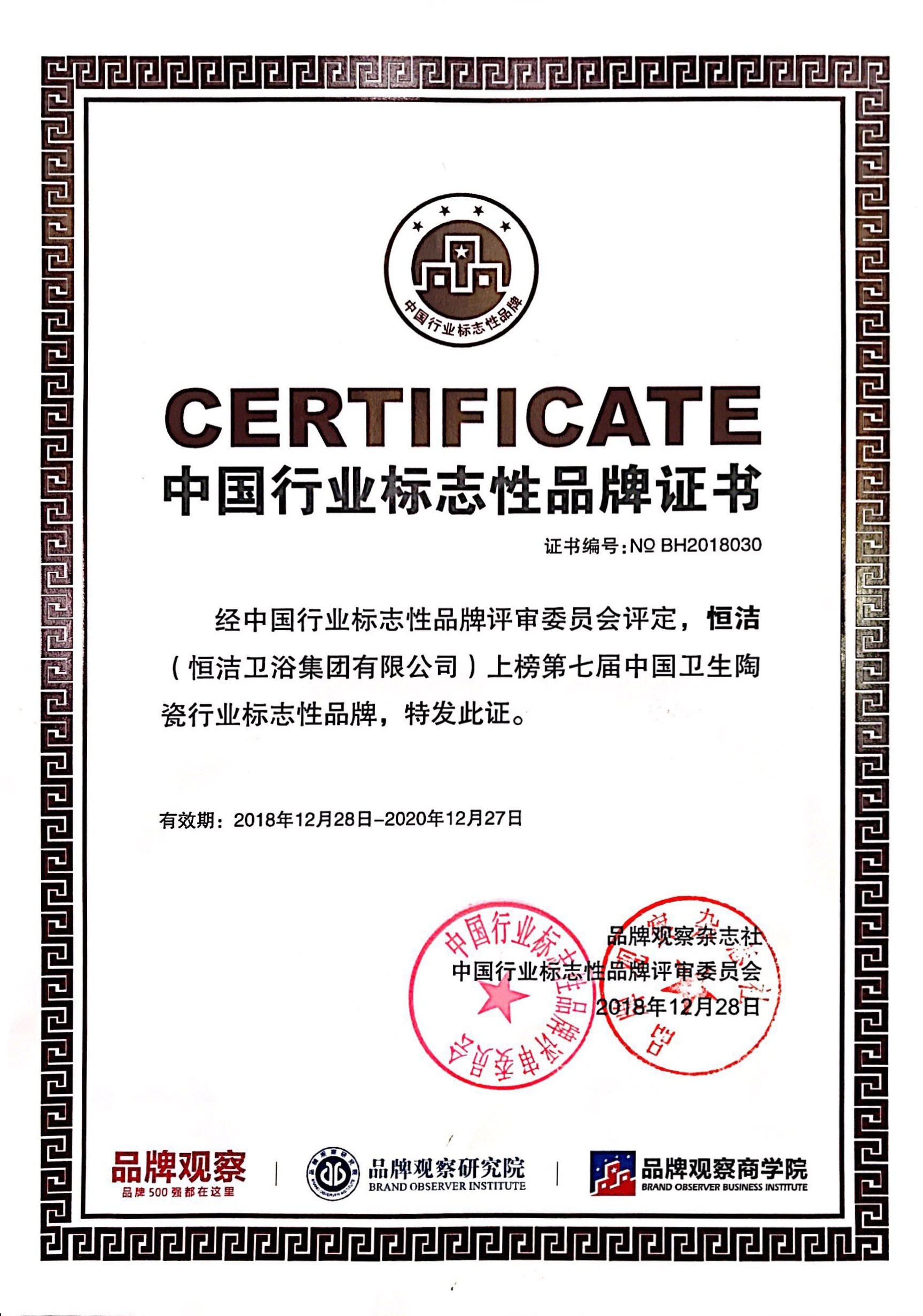 12月28日,由中國商業(yè)經(jīng)濟學會、全國品牌社團聯(lián)席會、品牌觀察雜志社、品牌觀察研究院、品牌觀察商學院、北京國信品牌評價科學研究院聯(lián)合舉辦的第7屆中國行業(yè)標志性品牌頒獎儀式在福州舉行,恒潔榮膺行業(yè)唯一的「2018中國衛(wèi)生陶瓷行業(yè)標志性品牌」,與同時上榜的華為、格力、方太等各自行業(yè)的標志性品牌一道,共顯中國品牌風采。