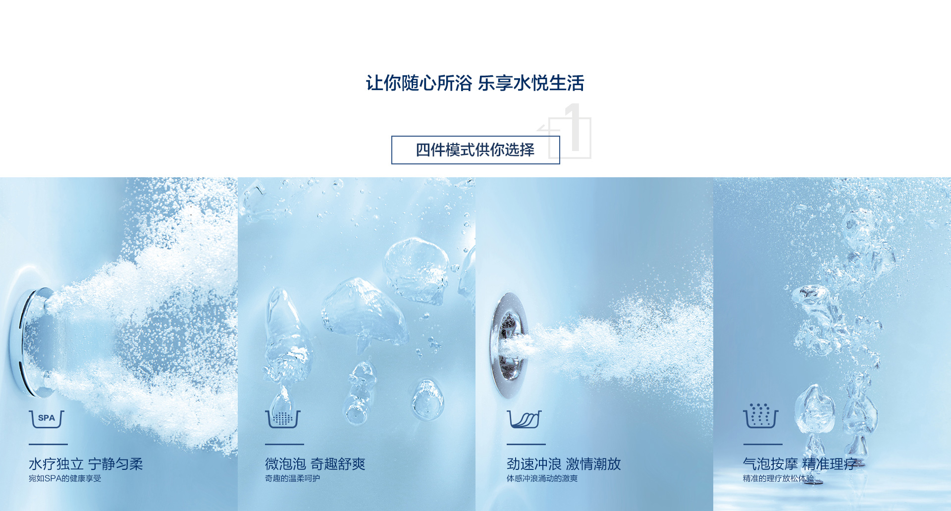 勁速沖浪按摩系統(tǒng)、微泡泡按摩系統(tǒng)及汽泡按摩系統(tǒng)四件模式供你選擇,讓你隨心所浴,樂享水悅生活